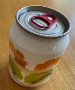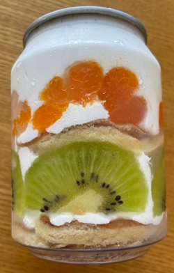 広島スイーツファクトリーのもので、みかん、キウイ、パイナップル、バナナなどがはいっており、生クリームが多め。生クリームは甘さ控えめで食べやすい。スポンジケーキは水分量が多くてしっとりしている。全体的にほどよい甘さ。