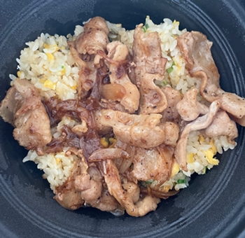 生姜焼きが上にのっているチャーハンで、生姜焼きはタレがついていてしっかり塩味がついている。