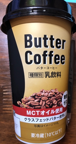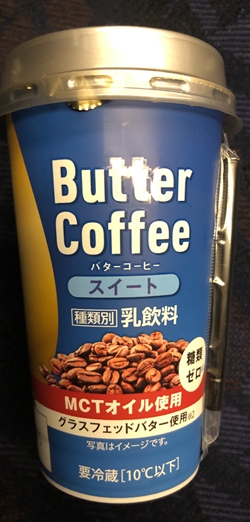 ノーマルタイプ バターコーヒー ファミリーマートバターとコーヒーを混ぜた飲み物で、MCTオイルという良質な油がとれる。甘さはなくて後味にとても油感がある。バターは焦がしたような味があって少し独特。甘さはなくて少し苦味がある。