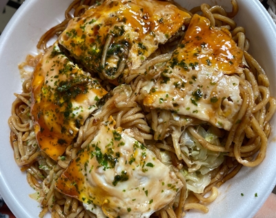 キャベツは十分に火が通っていて、しっとりしている。堅めで弾力がある食感。イカ天がスタンダードのよう。ソースはみつばソースでうっすらで甘め。下の生地はもっちりしている。そばは太めで少しモチッとしている。