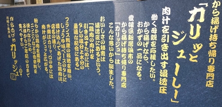 そのこだわりはしょうがやにんにくなどの香辛料を使用せず、塩分と水分の配合にこだわり、フランス料理の技法を用い、しょうゆ味ベースのタレに漬け込んであげた鶏肉は、?店名の通り、外側はカリッ、口の中には肉汁がジュッと広がります。