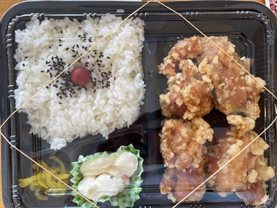 から揚げが4つ入った弁当で、チリマヨは別でソースがついている。辛子が入ったマヨネーズとオーロラソースが混ざっているような味で比較的辛子は辛め。濃厚なソース。から揚げは衣がおいしくてカリカリしている。塩コショウがしっかりきいていて油感もある。