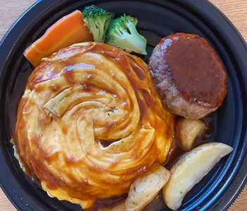 デミグラスソースがかかっていて、ハンバーグは手作りのよう。オムライスは卵が上にのっており、ふわっとしていて、味はついていない。ケチャップライスは本格的な味わいで少しパサッとしていて硬めのご飯。